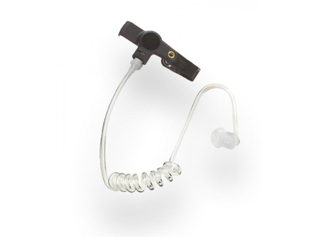 Průhledný zvukovod s kovovou černou sponou, se standardní průhlednou silikonovou olivkou, určený do běžného nehlučného prostředí. Zvukovod se používá pro pohodlnější použití diskrétní audio soupravy.